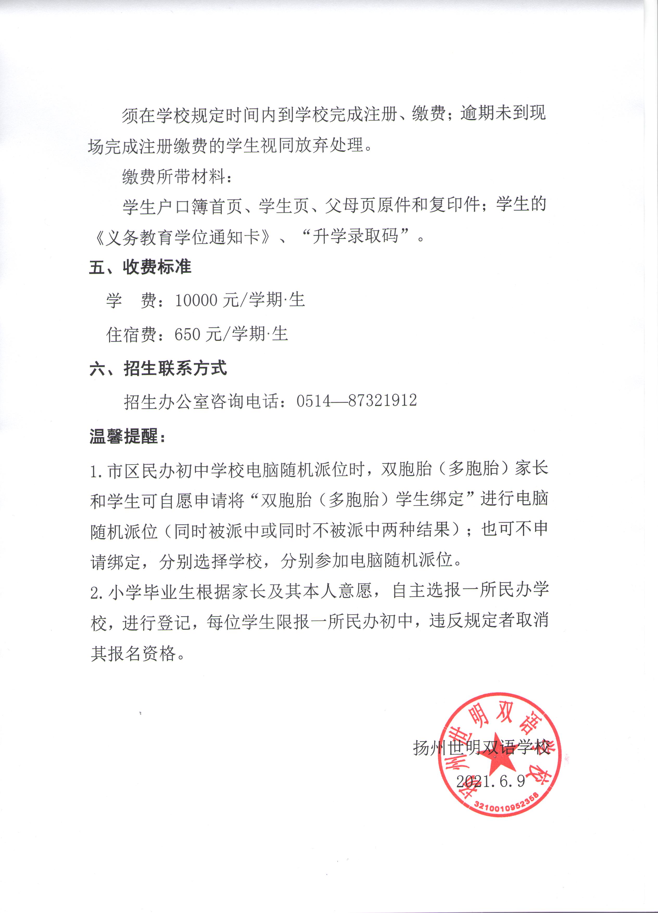 2021年揚(yáng)州世明雙語(yǔ)學(xué)校初一招生方案