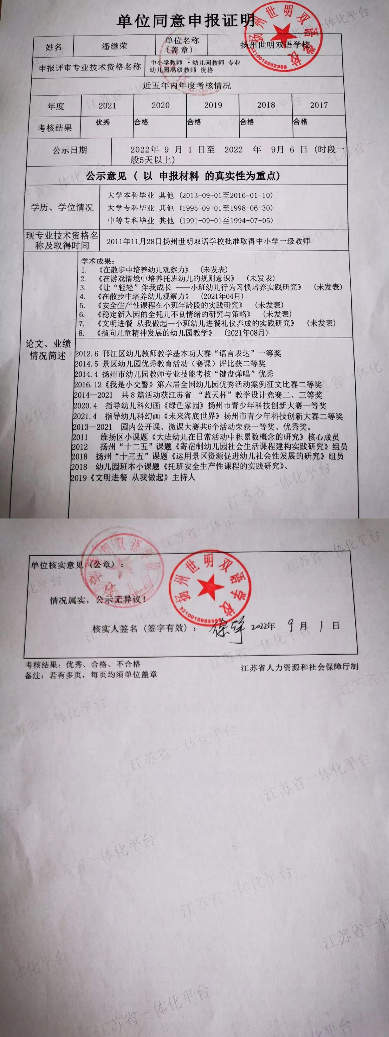 ???? 經(jīng)學(xué)部研究,擬推薦潘繼榮同志申報(bào)幼兒園副高級(jí)職稱,現(xiàn)予以公示。公示期間:9月1號(hào)---9月7號(hào),如有異議,可向幼兒園部師德師風(fēng)領(lǐng)導(dǎo)小組反映,電話:0514—87314783