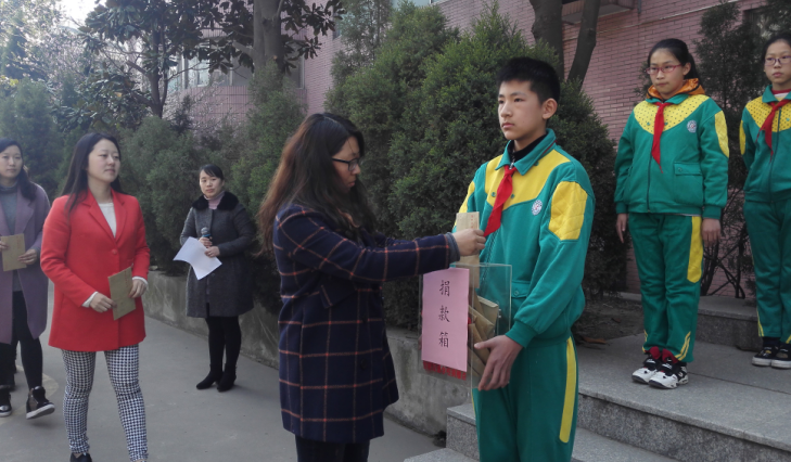 ? ? ? ??? ?? 一方有難,八方支援。一個(gè)星期前,世明雙語(yǔ)學(xué)校小學(xué)部接到兄弟學(xué)校揚(yáng)州市汶河小學(xué)大隊(duì)部的“愛(ài)心捐款倡議書(shū)”,號(hào)召我校全體師生為汶河小學(xué)五四班身患被稱(chēng)為“兒童腫瘤之王”----神經(jīng)母細(xì)胞瘤的劉水同學(xué)捐款,幫助他和他的家庭共同戰(zhàn)勝病魔,渡過(guò)難關(guān)。<!--?xml:namespace prefix = o ns = "urn:schemas-microsoft-com:office:office" /--> ?????? 世明雙語(yǔ)學(xué)校大隊(duì)部第一時(shí)間向全體老師、隊(duì)員們發(fā)出倡議,立即得到了全校師生的積極響應(yīng),大家紛紛伸出援助之手,積極參與到這次“愛(ài)心捐款”活動(dòng)中來(lái)。三三班的王欣怡家長(zhǎng)得知這一消息后,不光自己個(gè)人捐助,還發(fā)動(dòng)身邊的朋友共同為劉水同學(xué)獻(xiàn)愛(ài)心。點(diǎn)滴愛(ài)心,匯聚成河,人間大愛(ài),唱響世明。3月29日上午的晨會(huì)課上,我們?nèi)w師生齊聚學(xué)校操場(chǎng)舉行了“向劉水同學(xué)獻(xiàn)愛(ài)心”的捐款儀式。伴隨著一曲《愛(ài)的奉獻(xiàn)》,各班愛(ài)心天使代表和部分教師代表將善款投入捐款箱內(nèi)。一份份心意,一個(gè)個(gè)牽掛,此次募捐共得善款三萬(wàn)一千余元,這筆捐款將通過(guò)揚(yáng)州市慈善總會(huì)定向幫助劉水同學(xué)。相信在大家的愛(ài)心陪伴下,劉水同學(xué)一定能早日康復(fù),重返校園! ??????? 這次愛(ài)心捐款活動(dòng)體現(xiàn)了世明師生樂(lè)于助人的高尚品德,也進(jìn)一步展現(xiàn)了我?!安?ài)”特色教育的成果,同時(shí)也是全體師生努力踐行社會(huì)主義核心價(jià)值觀的生動(dòng)體現(xiàn),全校師生的一顆顆愛(ài)心必將化成劉水同學(xué)與死神對(duì)抗的力量!