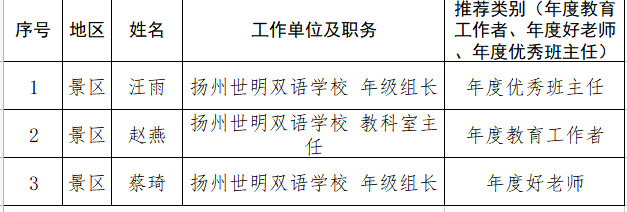 公示時間:2023年5月30日-6月7日。對公示人選如有異議,可向揚(yáng)州世明雙語學(xué)校小學(xué)部反映,聯(lián)系電話:18205277370,郵箱:358551973@qq.com。