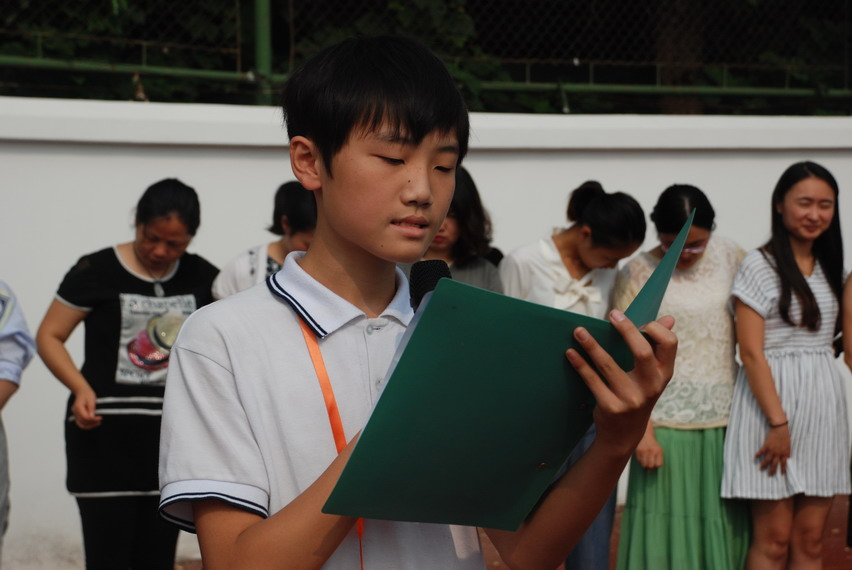 活動開始,三個年級學生代表分別發(fā)表自己的感恩致辭。初一年級發(fā)言的學生代表周唐欣同學的媽媽也是一位人民教師、也是一位班主任,所以孩子在發(fā)言中滿是對老師工作不易的體諒,滿是對同學們認真聽話的叮囑;初二年級發(fā)言的周蘇慧同學并沒有特別地去寫發(fā)言稿,而是為大家讀了開學剛寫的一篇作文《我和老師的故事》,作文寫的是她的語文老師王婭娜老師,細致地講述了老師在語文教學的細節(jié)以及和孩子們交心的點滴,字里行間都是對老師的感恩;初三年級的學生代表來自初三2班,是夏春羽同學,他作為初三年級的代表,初一初二同學的學長,一個在世明大家庭成長了兩年多的孩子,對老師的辛勞很是心疼,對老師的教導很是感謝,同時,也一遍一遍地提醒著學弟學妹們一定要懂事、要聽話、要讓老師少操點心少受點累。三位代表發(fā)完言分別向他們的班主任獻上了一束鮮花。