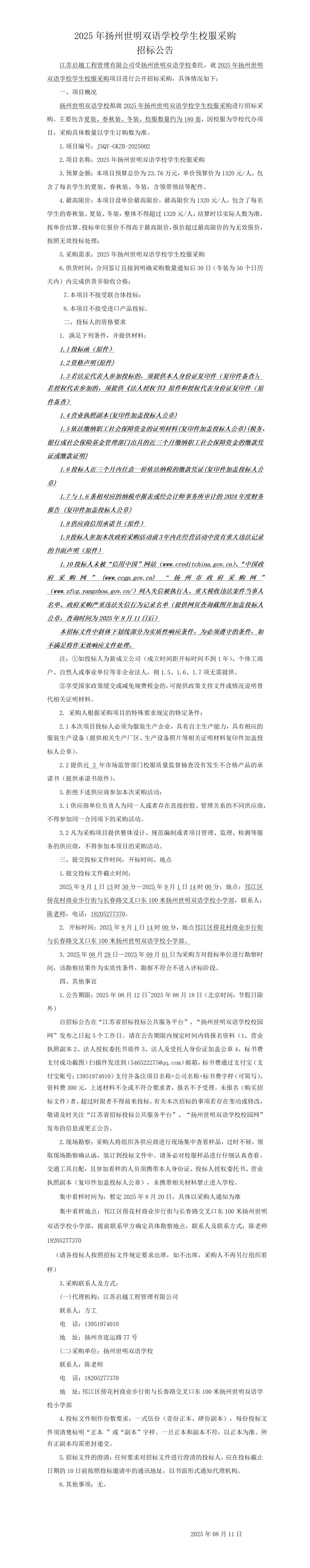 2025年揚州世明雙語學校學生校服采購 招標公告