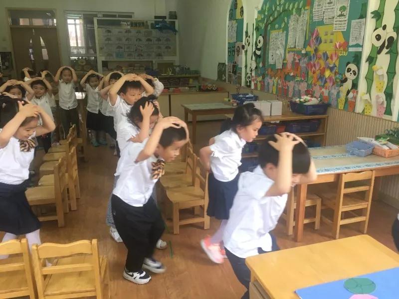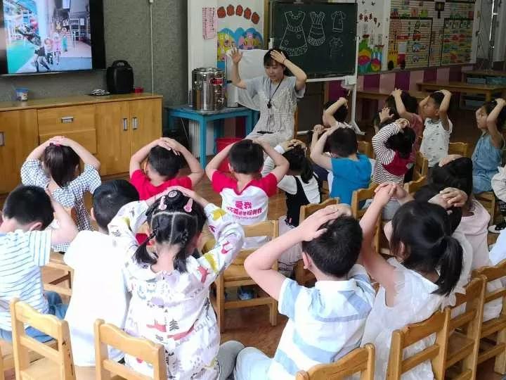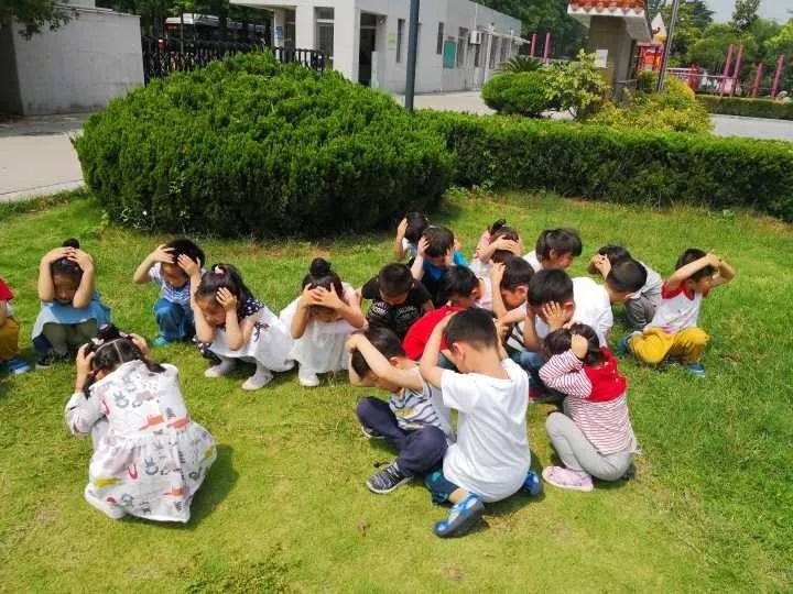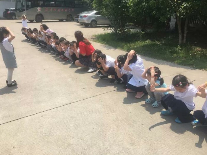 其次,是年級組的逃生演習。統(tǒng)一時間,分散線路,在幼兒游戲中的狀態(tài)下,警報聲突然鳴起,緊接著小朋友們在班級老師緊張有序的組織下抱著頭、彎腰低身,在指定的路線下逃離教室,一樓的班級不到一分鐘,二樓班級一分半鐘全部到達安全地帶。
