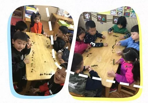 ? ? ?現(xiàn)在老師要來考考你們,請每組成員相互調(diào)配,保證每個人杯子里有五個水杉果,把多余的放在你們的桌子中間。記住不僅自己是五個,你們這組的每個人都必須是五個。我的要求一講完,孩子們便開始忙碌起來。有部分孩子將水杉果倒下來,數(shù)了五個放進(jìn)自己的杯子里,然后就開始觀望其他小朋友了。而有個別能力強(qiáng)的小朋友就開始關(guān)注到其他同伴,是不是大家都有五個了,發(fā)現(xiàn)剛才撿的少的同伴不夠五個,于是便將自己多余的拿給他,讓他也變成五個。剛剛觀望的孩子,在他的帶動下,也開始關(guān)注身邊的同伴,拿過他們的杯子,幫著數(shù)數(shù)是否都是五個,再次確認(rèn)一下是否正確。在大家的齊心協(xié)力下,每桌孩子都按要求完成了任務(wù),每桌桌子中間都堆著一小堆多余的水杉果,就像剛剛團(tuán)結(jié)在一塊,互相協(xié)助的孩子們!